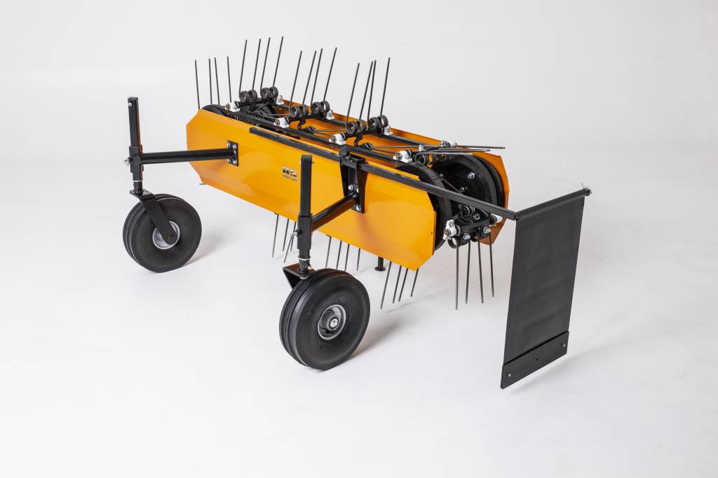 The working depth can be continuously adjusted on the two front support wheels. Freely rotating front wheels also ensure maximum manoeuvrability of the machine. The belt rake can be conveniently parked on the height-adjustable support foot.
