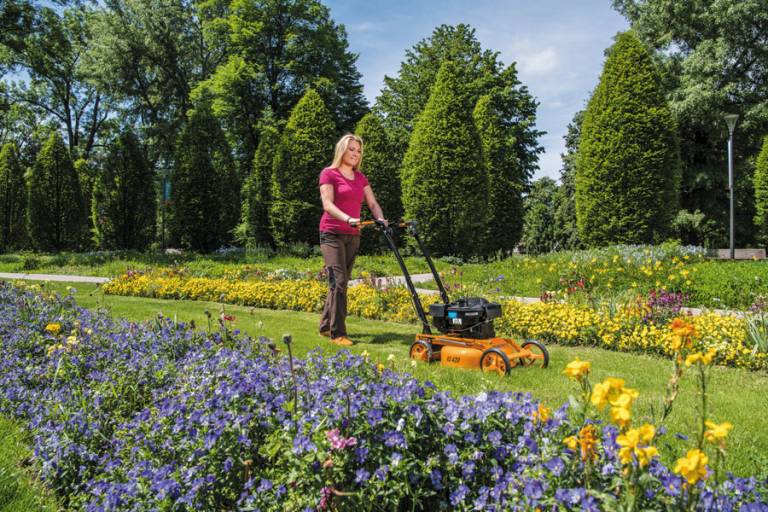 Double ball-bearing front wheels and rear wheel drive provide easy handling. The front wheels’ special wedge shape minimizes impact on the grass, which quickly springs back up to be cut by the blade. This makes the cutting pattern extremely uniform. Cutting height can be adjusted centrally in a range from 40–80 mm via a spring-supported system, by foot or by hand.