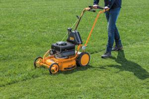 A third crankshaft bearing and friction discs on the mulching blade protect the engine in the event of unseen obstacles while a variator allows the convenient adjustment of speed from 2.1–4.3 km/h while in motion. Double ball-bearing front wheels and rear wheel drive provide easy handling. The front wheels’ special wedge shape minimizes impact on the grass, which quickly springs back up to be cut by the blade. Cutting height can be adjusted to 6 levels from 40–90 mm via a spring-supported system.